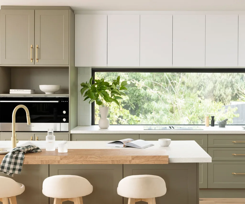 In the style selector: We love pairing doors and panels in Danish blue (a gorgeous, subtle blue that reminds us of beach skies) and benchtops in bambucha, a customisable blonde-toned matte laminate that looks and feels like real bamboo, to give your home a resort-like feel. For wall paint, try off-whites like whitehouse and miss universe, to give a salt-flecked, lived-in feel.