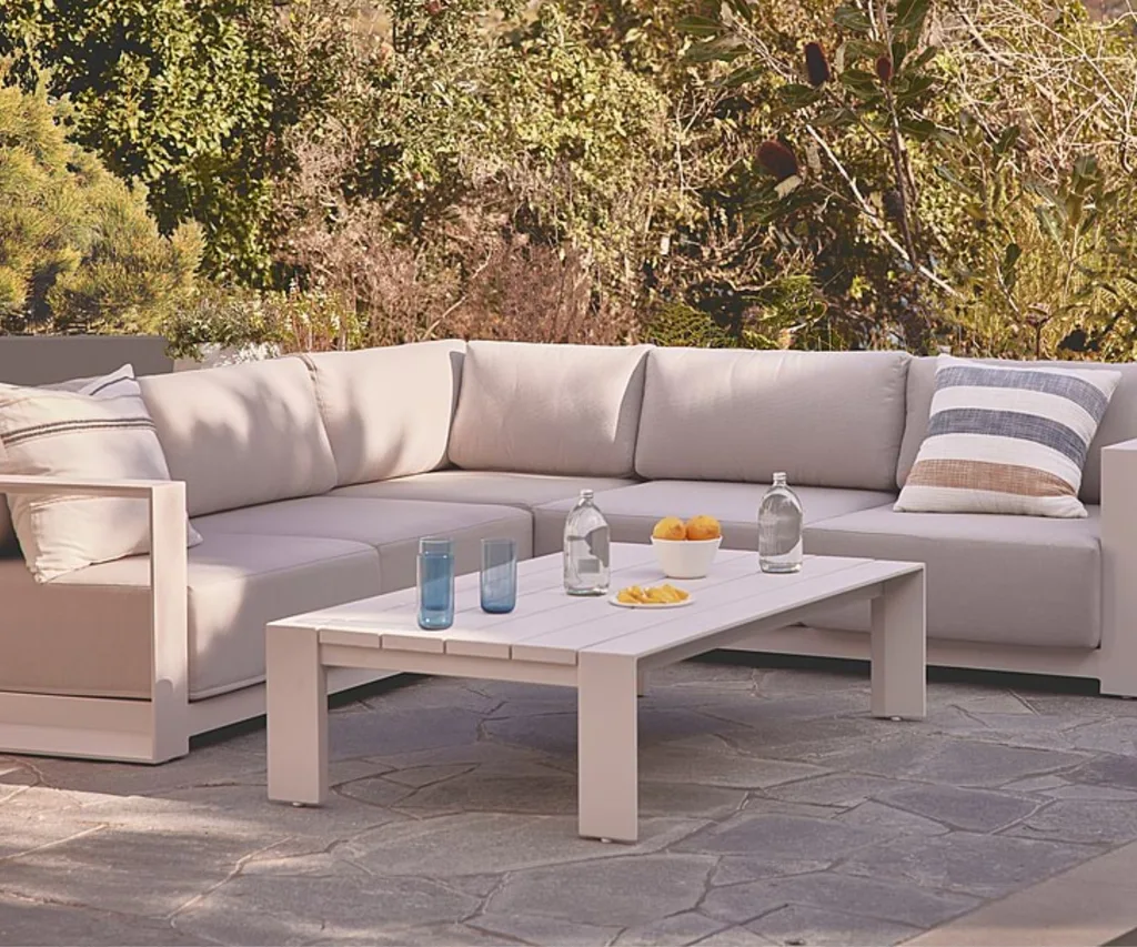 I start with a relaxed and comfortable corner sofa, so I can add cushions and throws (for those cooler summer nights) to personalise the space. I prefer the modern industrial aesthetic of aluminium. The added bonus is that its strong, square frame stands out in contrast to the garden and I know it’s easy to clean and will last in the harsh New Zealand sun.