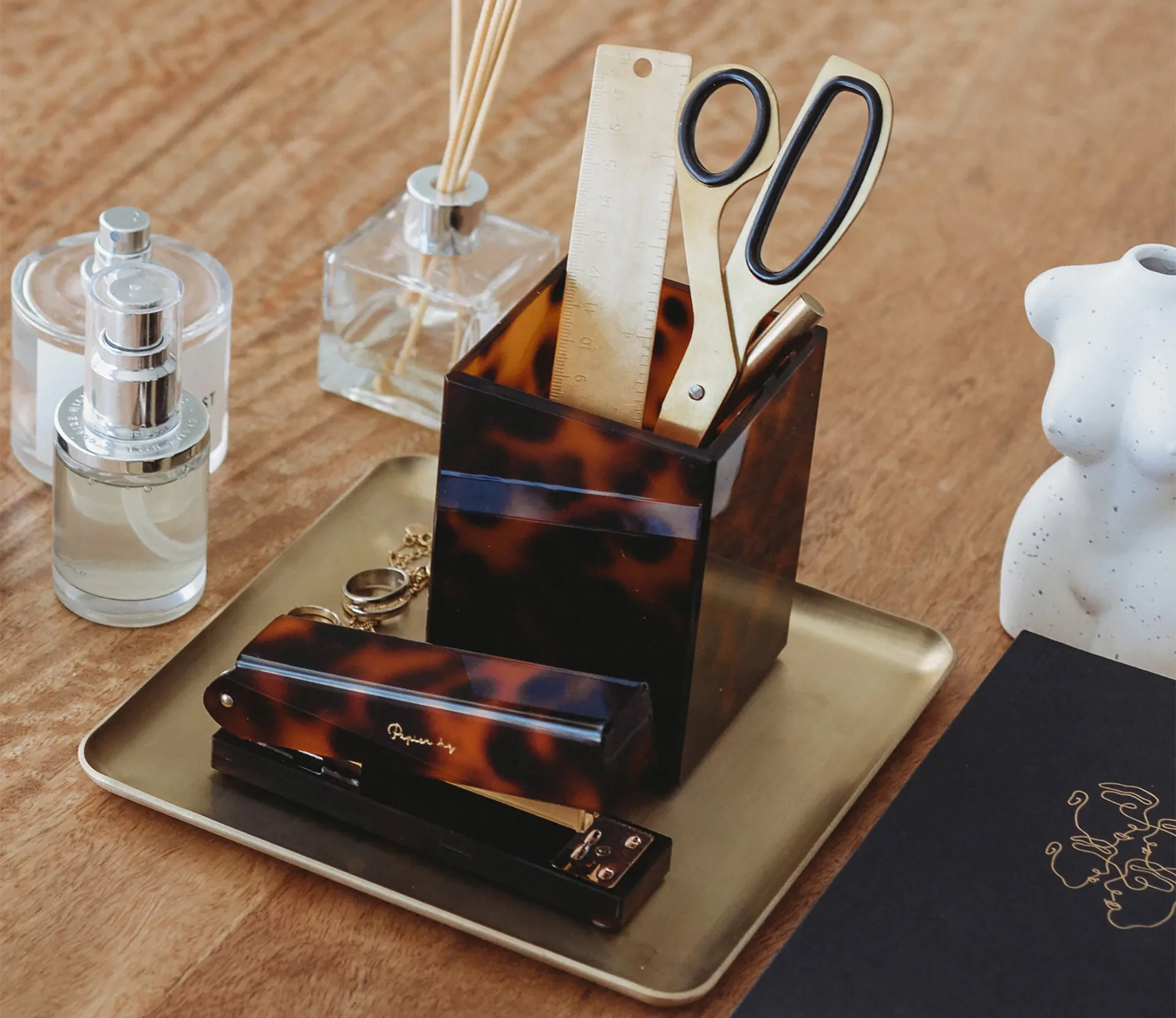 Papier HQ Leopard stapler and pen cup, $39 each, from Flux Boutique